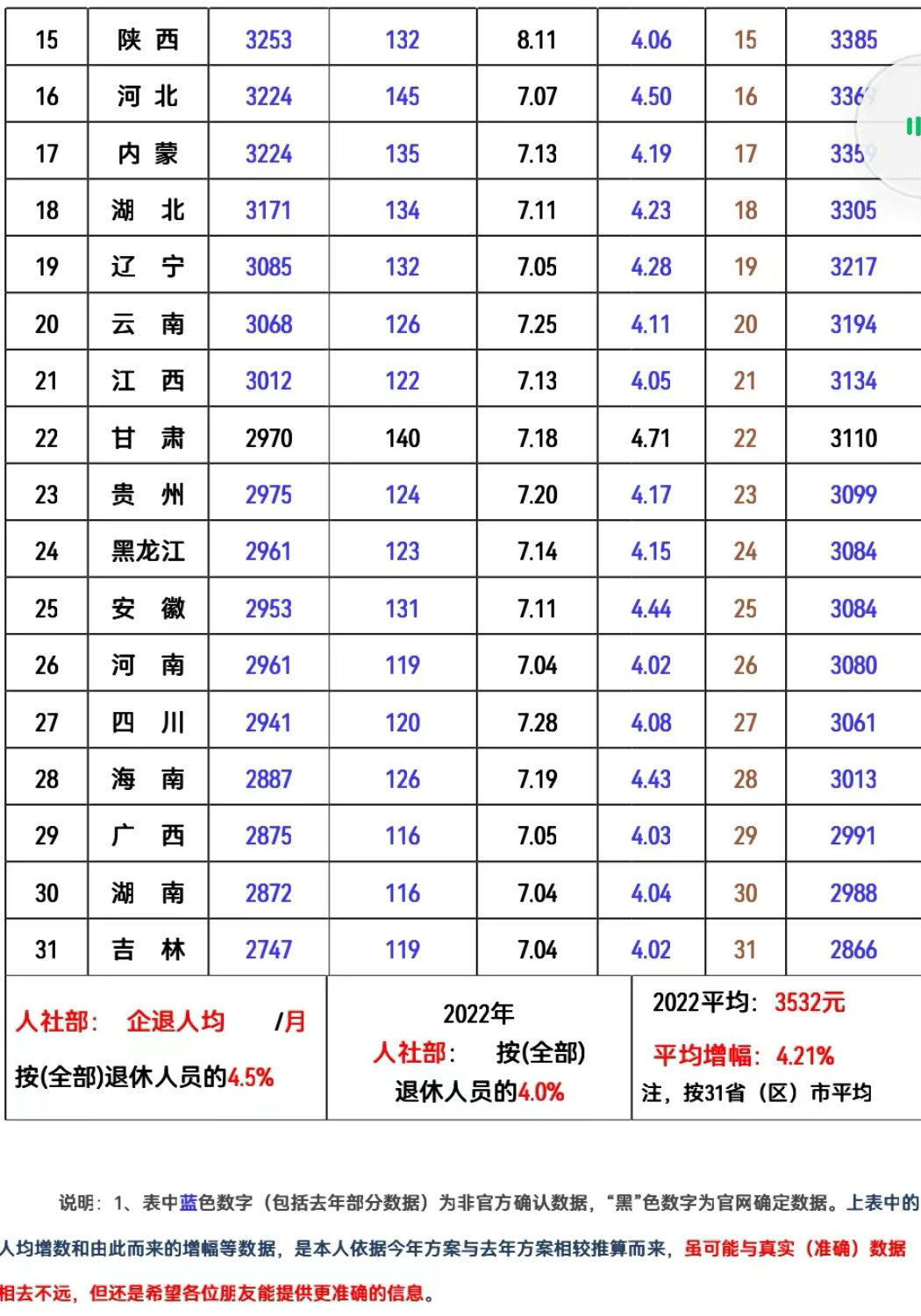 2022年全國(guó)各地區(qū)退休人員基本養(yǎng)老金調(diào)整后人均估算表