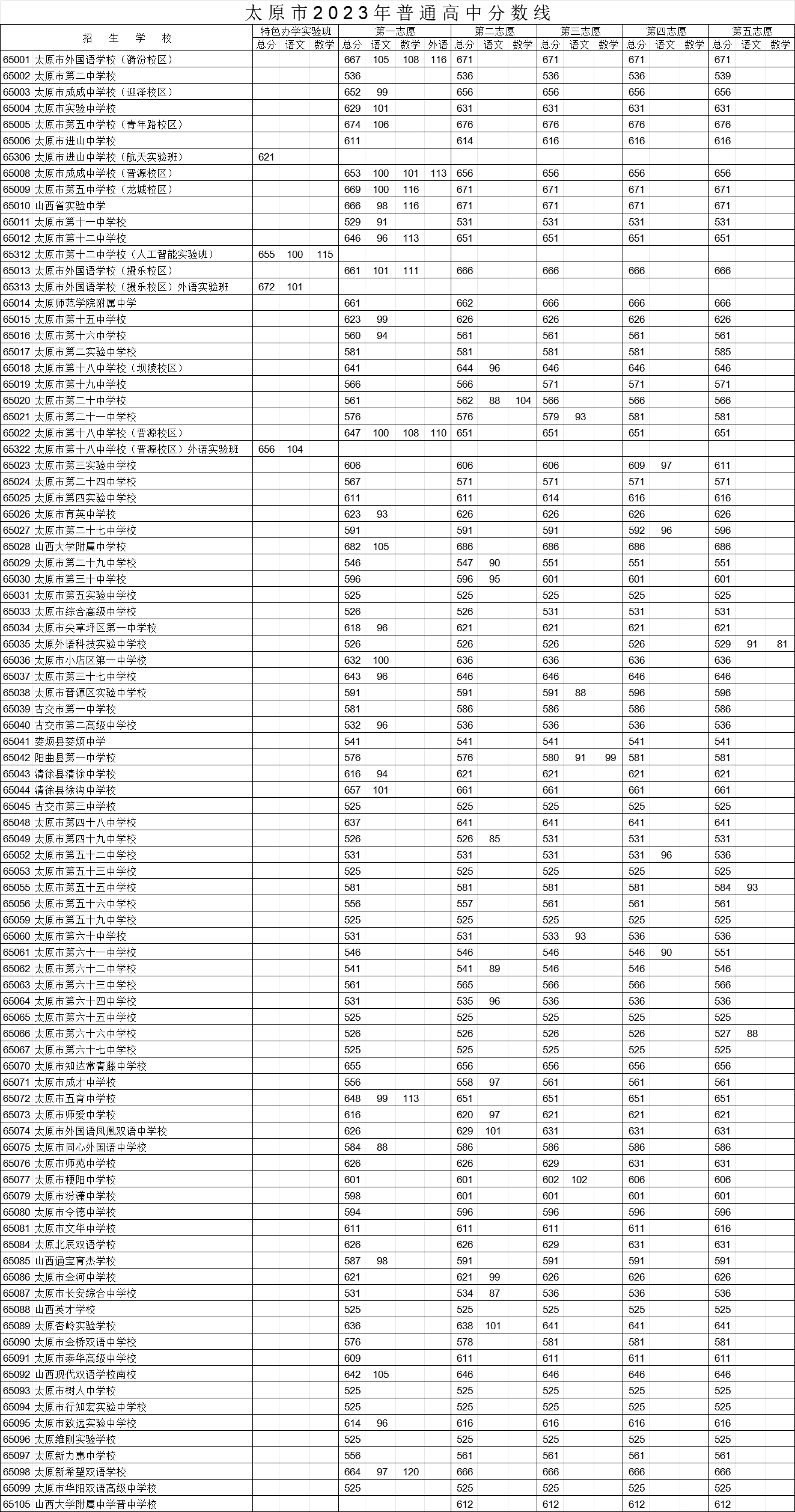 太原市進(jìn)山中學(xué)校航天實(shí)驗(yàn)班、太原市第十二中學(xué)校人工智能實(shí)驗(yàn)班、太原市外國語學(xué)校(攝樂校區(qū))外語實(shí)驗(yàn)班、太原市第十八中學(xué)校(晉源校區(qū))外語實(shí)驗(yàn)班,分?jǐn)?shù)線控制在中考總分85%(2023年為621分)的基礎(chǔ)上,按計劃、按分?jǐn)?shù)、按志愿擇優(yōu)錄??;進(jìn)山中學(xué)初中航天實(shí)驗(yàn)班在籍考生填報本校航天實(shí)驗(yàn)班志愿,在全市普通高中最低錄取控制線上按招生計劃優(yōu)先擇優(yōu)錄取。