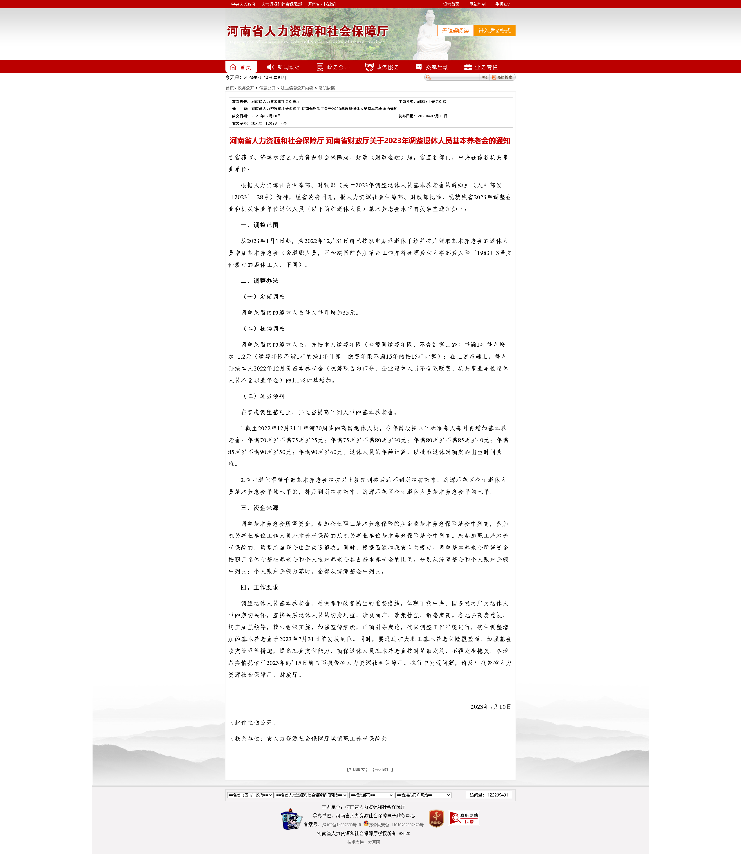 河南省人力資源和社會(huì)保障廳 河南省財(cái)政廳關(guān)于2023年調(diào)整退休人員基本養(yǎng)老金的通知