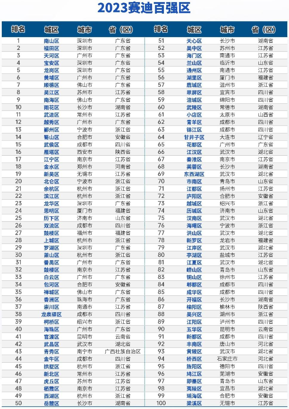 中國經(jīng)濟網(wǎng)北京8月9日訊(記者 李方) 城區(qū)是推動中國式現(xiàn)代化建設的“排頭兵”和“主戰(zhàn)場”。賽迪顧問8日發(fā)布研究顯示,在2023年賽迪百強區(qū)中,深圳南山區(qū)、深圳福田區(qū)、廣州天河區(qū)、深圳寶安區(qū)、深圳龍崗區(qū)、廣州黃埔區(qū)、佛山順德區(qū)、蘇州吳江區(qū)、佛山南海區(qū)和長沙雨花區(qū)位列2023年賽迪百強區(qū)前“十強”。