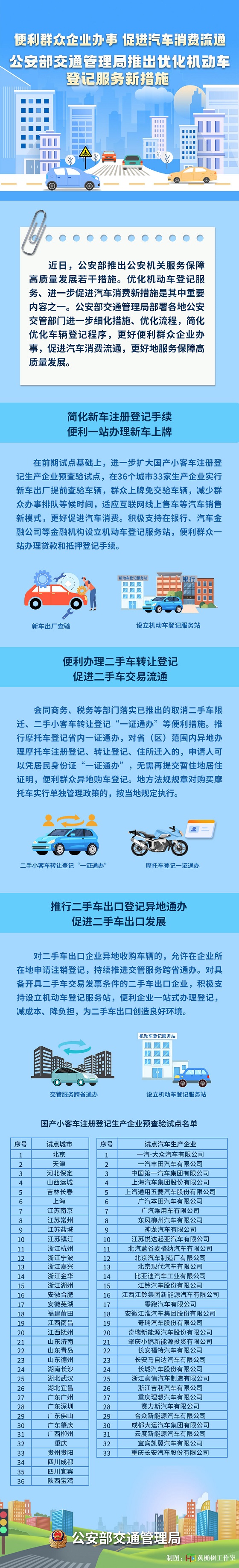 一、簡化新車注冊登記手續(xù),便利一站辦理新車上牌。在前期試點(diǎn)基礎(chǔ)上,進(jìn)一步擴(kuò)大國產(chǎn)小客車注冊登記生產(chǎn)企業(yè)預(yù)查驗(yàn)試點(diǎn),在36個(gè)城市33家生產(chǎn)企業(yè)實(shí)行新車出廠提前查驗(yàn)車輛,群眾上牌免交驗(yàn)車輛,減少群眾辦事排隊(duì)等候時(shí)間,適應(yīng)互聯(lián)網(wǎng)線上售車等汽車銷售新模式,更好促進(jìn)汽車消費(fèi)。積極支持在銀行、汽車金融公司等金融機(jī)構(gòu)設(shè)立機(jī)動(dòng)車登記服務(wù)站,便利群眾一站辦理貸款和抵押登記手續(xù)。