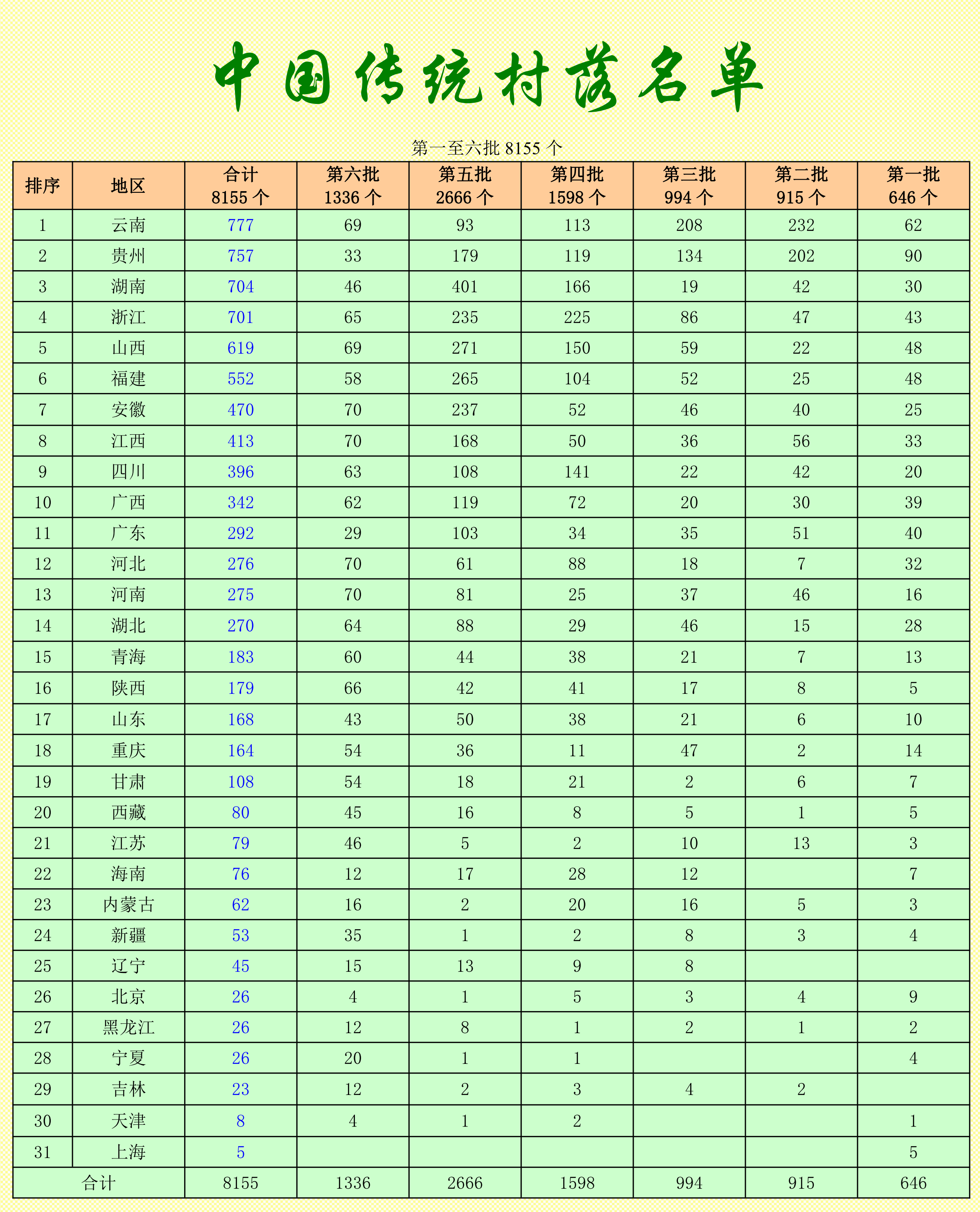 2012年以來(lái),住房和城鄉(xiāng)建設(shè)部會(huì)同有關(guān)部門(mén)分六批將8155個(gè)村落列入中國(guó)傳統(tǒng)村落保護(hù)名錄,山西就有619個(gè),數(shù)量位居全國(guó)第5位。從現(xiàn)存的傳統(tǒng)村落來(lái)看,山西已成為北方漢民族地區(qū)傳統(tǒng)村落數(shù)量最多、風(fēng)貌最完整、集聚度最高、類(lèi)型最豐富的省份。
