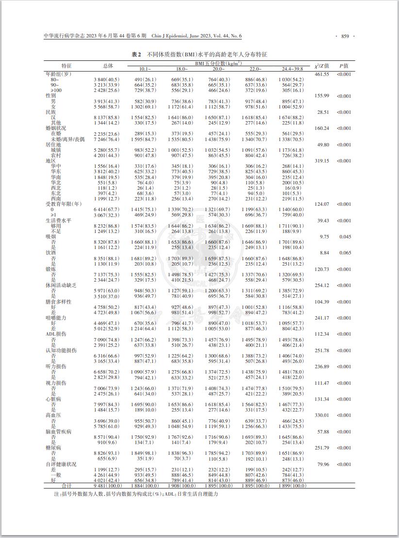 根據(jù)指南,高齡老年人指實足年齡大于或等于80歲的人。體質(zhì)指數(shù)(BMI)是一種計算身高體重的指數(shù),即體重與身高平方的比值。體質(zhì)指數(shù)適宜范圍指不良健康結(jié)局的發(fā)生風(fēng)險相對較低的處于某一特定范圍內(nèi)的人體(群)BMI。