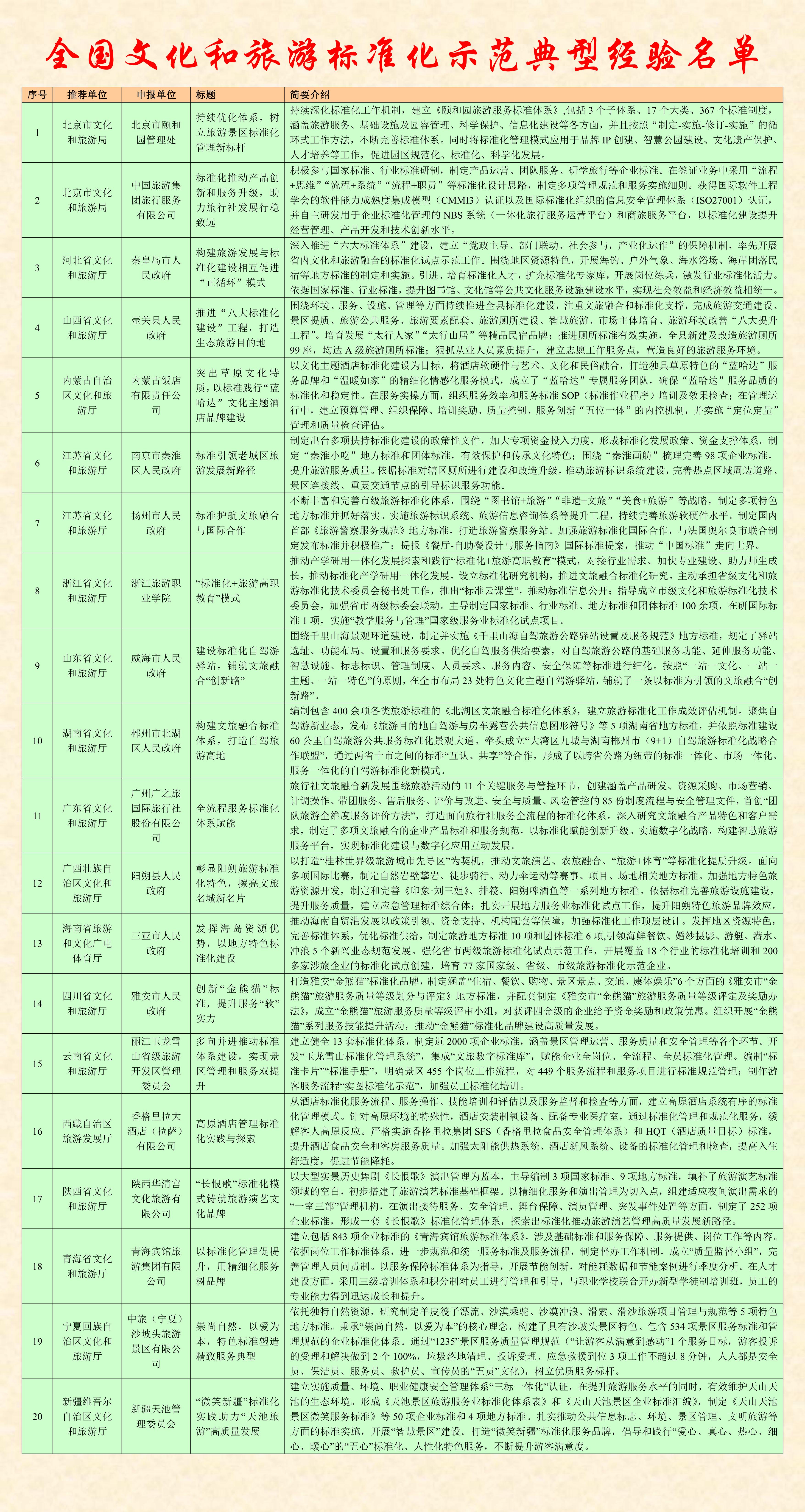 此次公布的名單共20項(xiàng),涉及多種類型單位,東中西部地區(qū)均有分布。這些典型經(jīng)驗(yàn)總結(jié)梳理了各地區(qū)、企業(yè)近年來的標(biāo)準(zhǔn)化工作成果,特別是標(biāo)準(zhǔn)化在文旅融合、科技創(chuàng)新、發(fā)展引領(lǐng)、優(yōu)化結(jié)構(gòu)、效益提升、國際化等方面的積極探索和有效實(shí)踐,突出創(chuàng)新性、引領(lǐng)性和示范性。