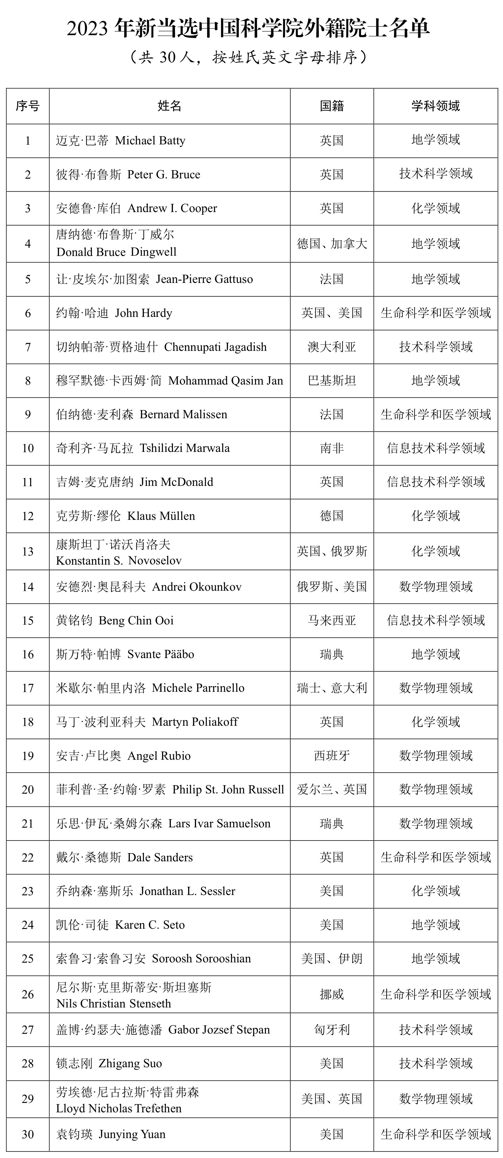 新華社北京11月23日電(記者張泉)中國科學院、中國工程院23日公布了2023年當選外籍院士名單,分別選舉產生30位中國科學院外籍院士、16位中國工程院外籍院士。