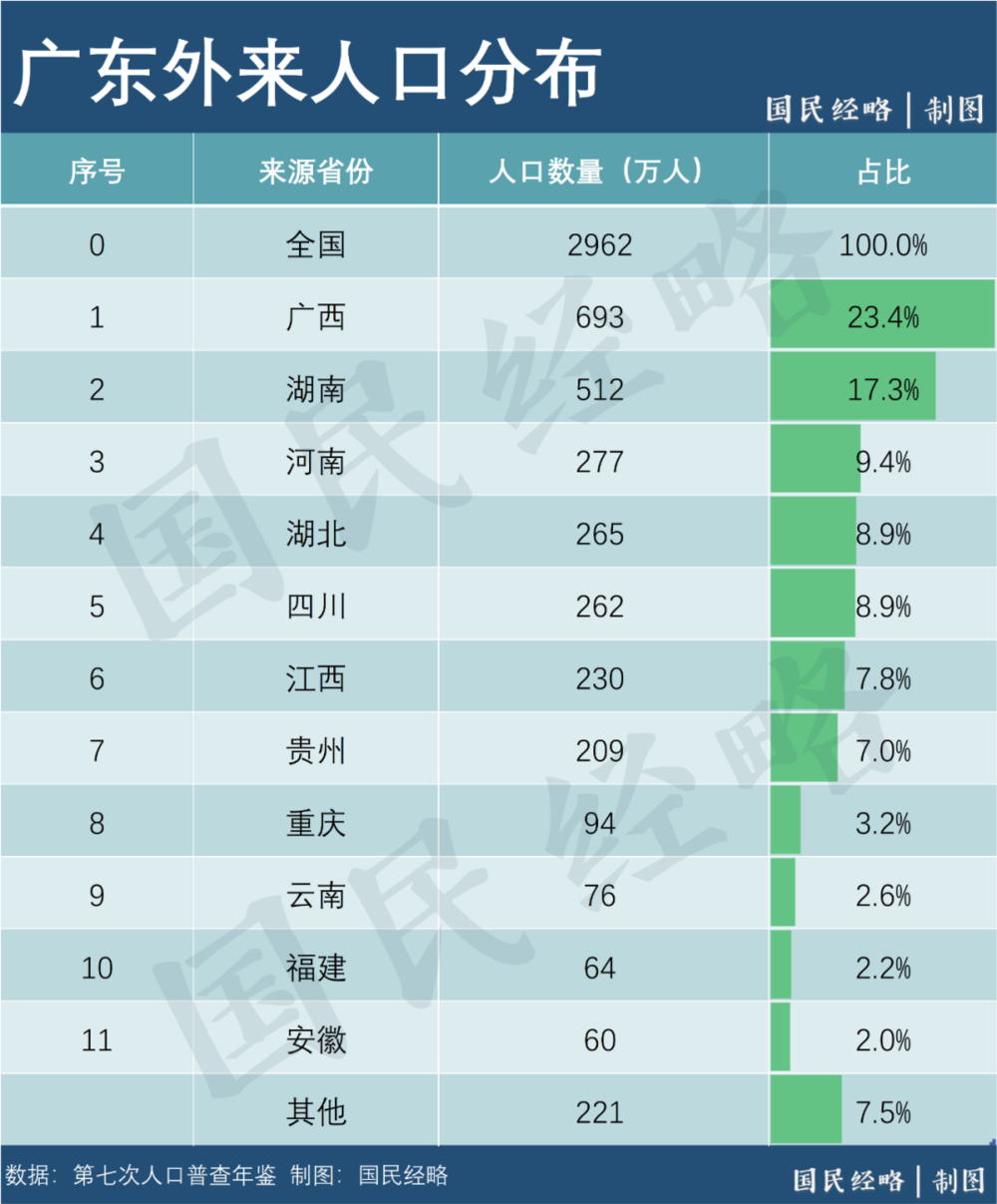 七普數據顯示,廣東外來人口總規(guī)模高達2962萬人,占總人口的1/4左右。
