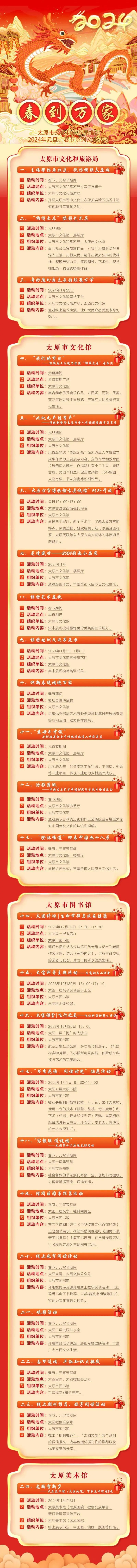 小店區(qū)將舉辦“龍年賀新春”鑼鼓大賽、“祥龍吟春”舞龍大賽,為龍年敲響賀歲鼓,還將舉辦文化講座、春聯(lián)下鄉(xiāng)、春節(jié)主題展等。迎澤區(qū)推出“星河璀璨,打鐵落花”、鐘樓步行街跨年儀式、“書香迎澤,云享文旅”、“聯(lián)墨迎春”碑林文化節(jié)等活動(dòng)。杏花嶺區(qū)依托各博物館紀(jì)念館等,舉辦文化文物系列活動(dòng)十大展、“博物院里過(guò)大年”等活動(dòng),采薇莊園雪地音樂(lè)節(jié)、東湖醋園賞醋景非遺文化活動(dòng)、商圈民俗表演、綜藝戲曲表演、旗袍春晚等,熱鬧十足。