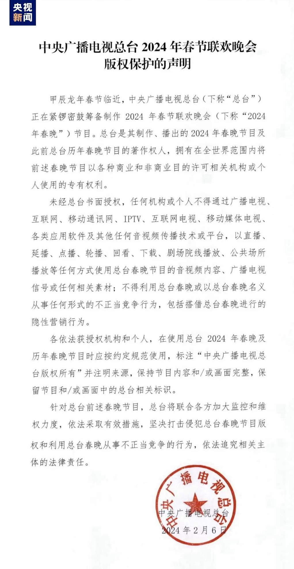 中央廣播電視總臺2024年春節(jié)聯(lián)歡晚會版權聲明