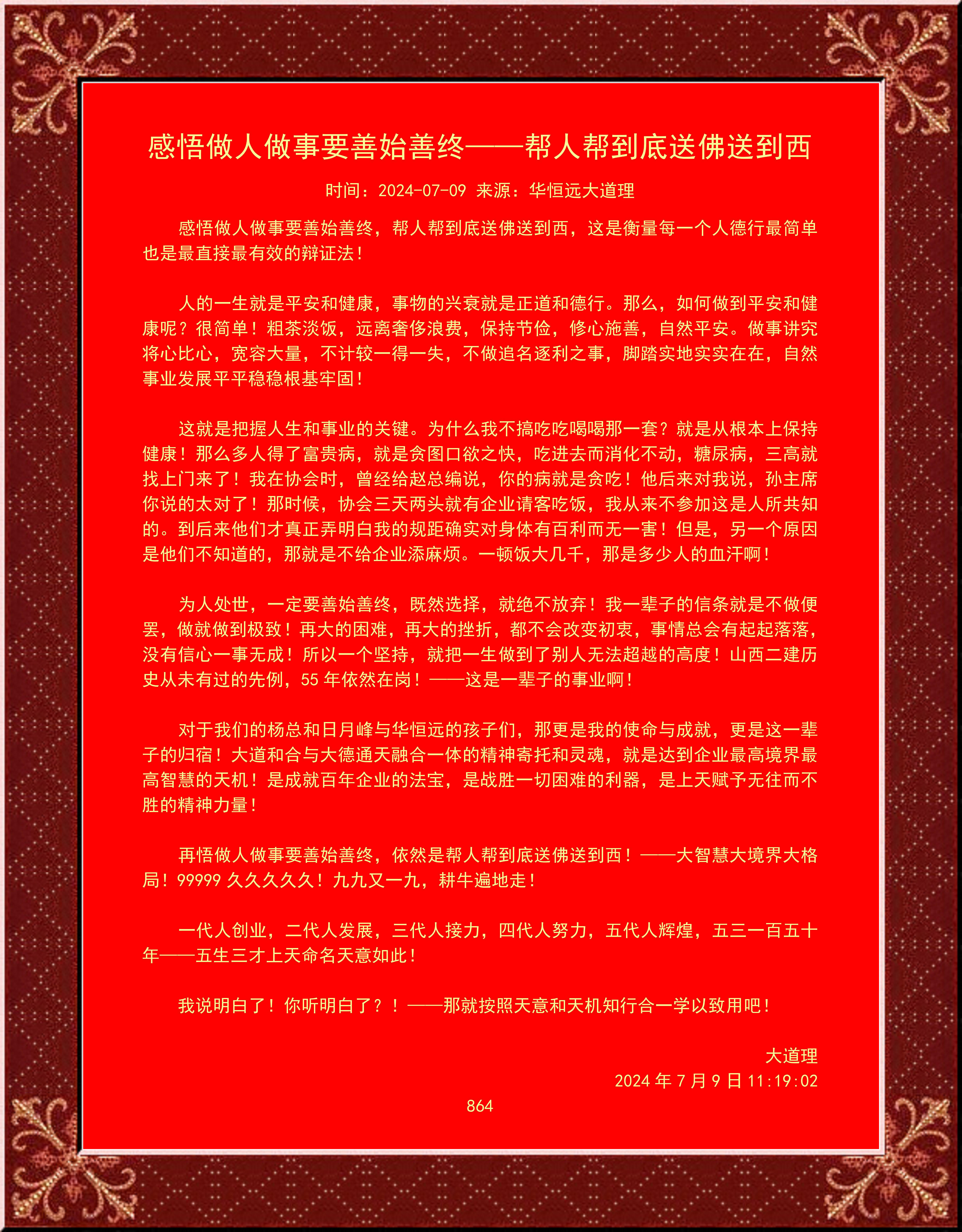對(duì)于我們的楊總和日月峰與華恒遠(yuǎn)的孩子們,那更是我的使命與成就,更是這一輩子的歸宿!大道和合與大德通天融合一體的精神寄托和靈魂,就是達(dá)到企業(yè)最高境界最高智慧的天機(jī)!是成就百年企業(yè)的法寶,是戰(zhàn)勝一切困難的利器,是上天賦予無往而不勝的精神力量!