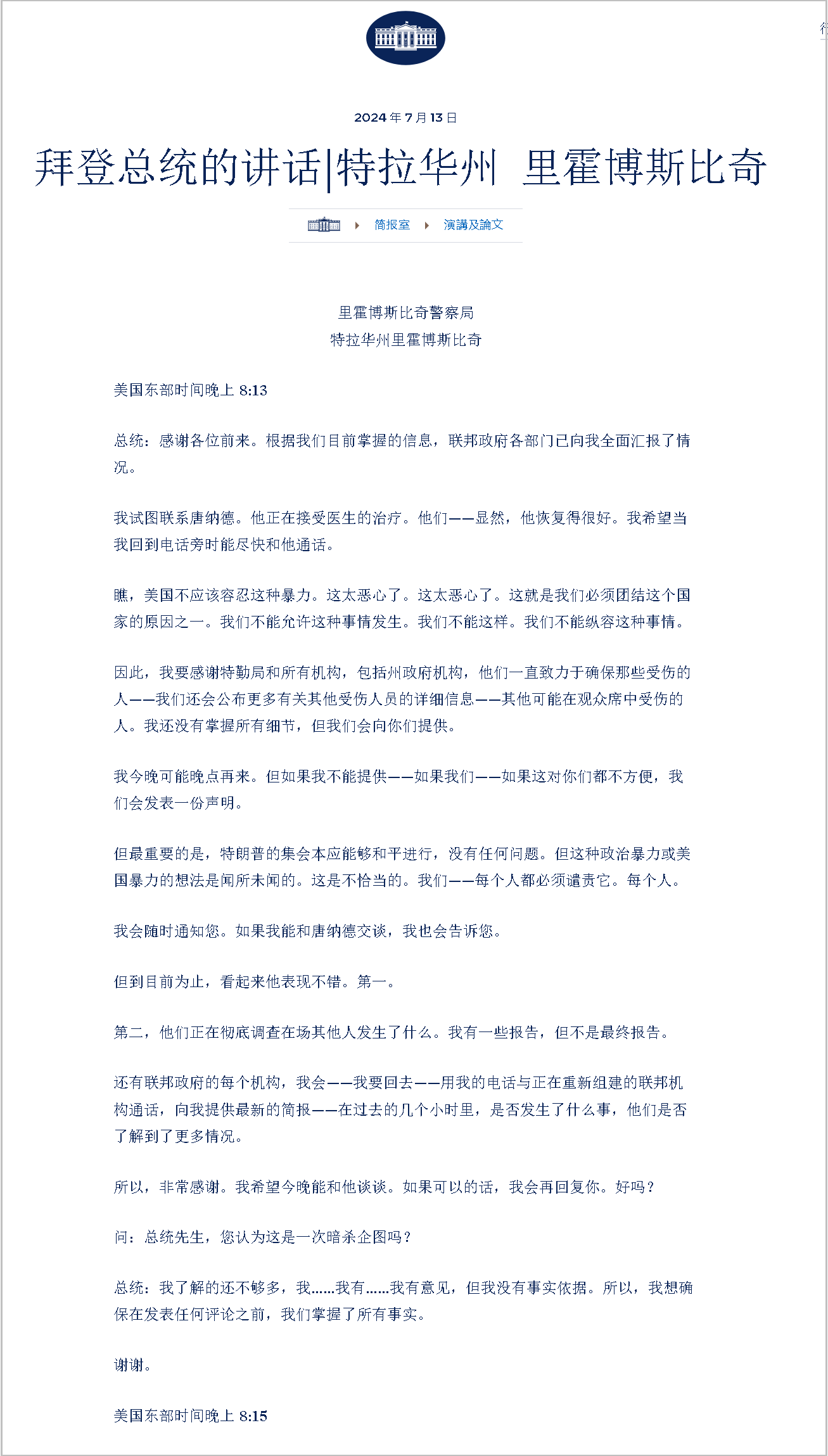 “吉爾和我感謝特勤人員把他(特朗普)帶到了安全的地方。在美國,這種暴力沒有立足之地。我們必須團結(jié)起來,作為一個國家來譴責它?!?/span>