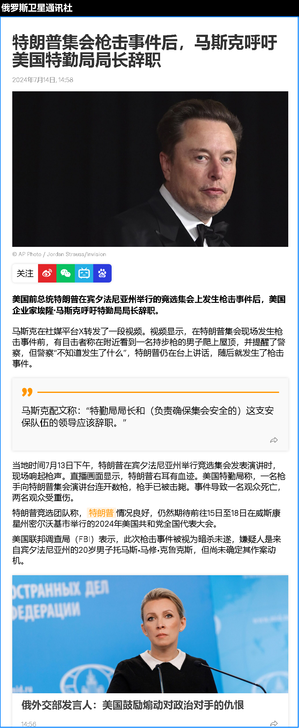 特朗普遇刺一案,疑竇重重,撲朔迷離。而馬斯克第一時間提出質(zhì)疑并且呼吁特勤局長辭職,似有所指!