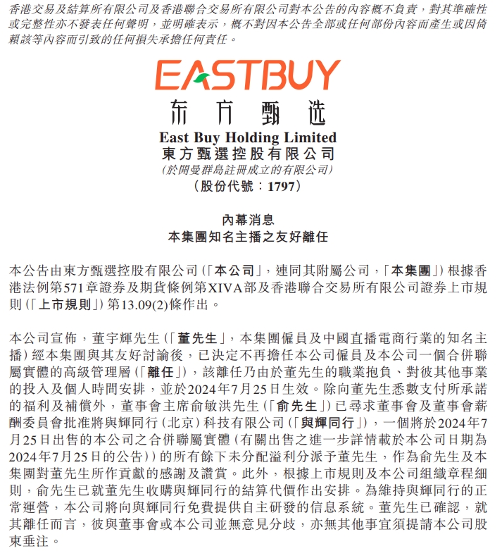同時,東方甄選在港交所公告,董宇輝(買方)、北京新東方迅程網絡科技有限公司(賣方)及與輝同行(北京)科技有限公司(目標公司)訂立出售協議,據此,賣方同意出售,而買方同意收購目標公司的100%股權,代價為人民幣7658.55萬元。