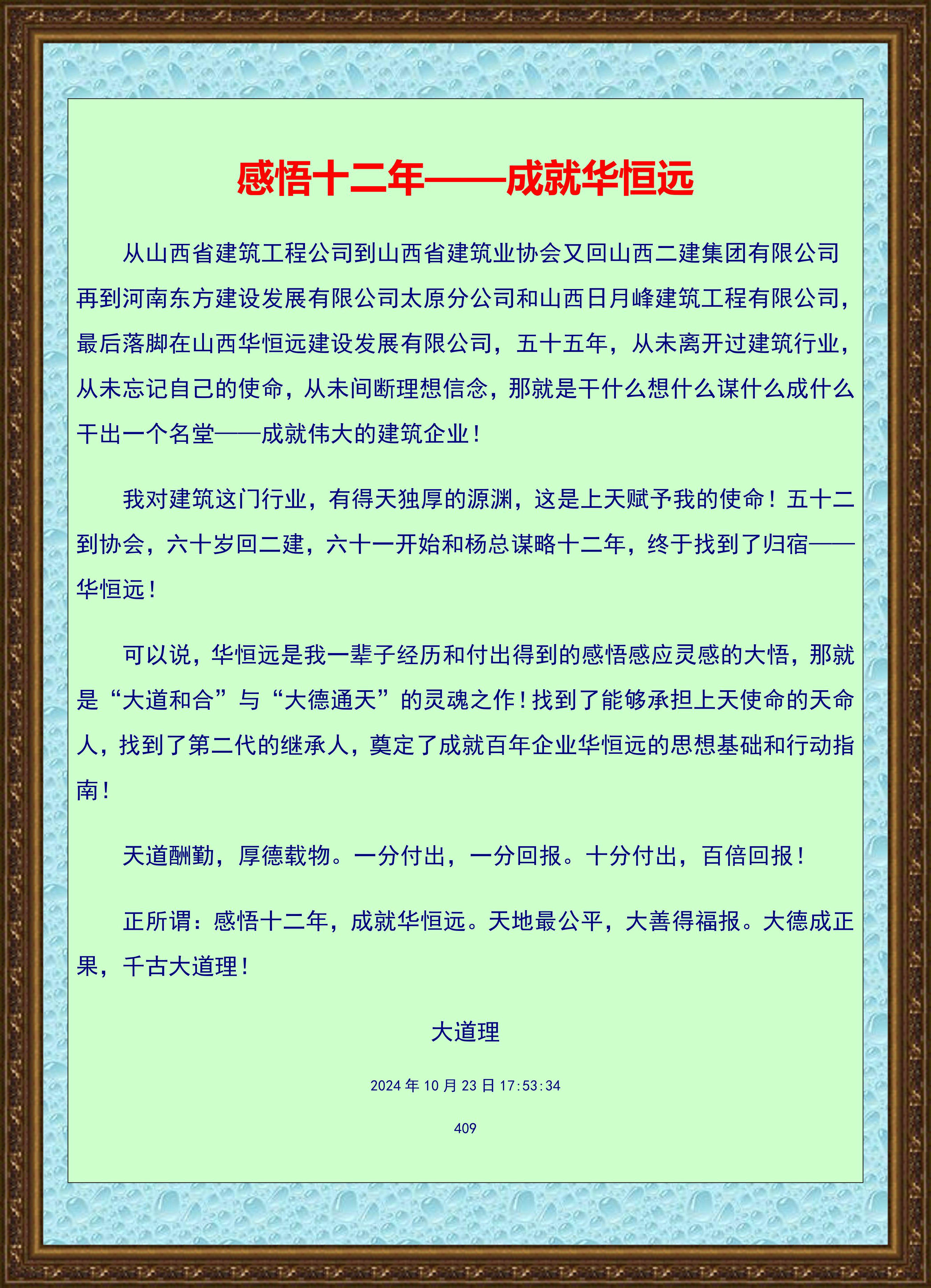 正所謂:感悟十二年,成就華恒遠(yuǎn)。天地最公平,大善得福報(bào)。大德成正果,千古大道理!