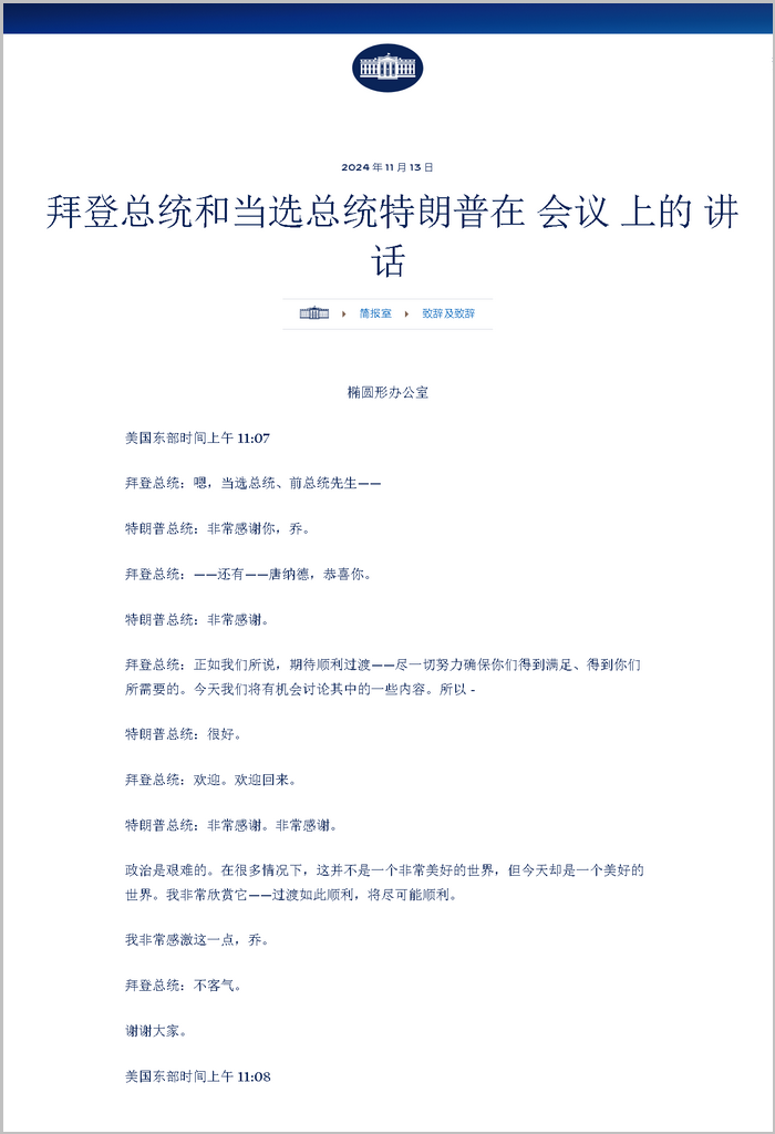 政治是艱難的。在很多情況下,這并不是一個(gè)非常美好的世界,但今天卻是一個(gè)美好的世界。我非常欣賞它——過(guò)渡如此順利,將盡可能順利。