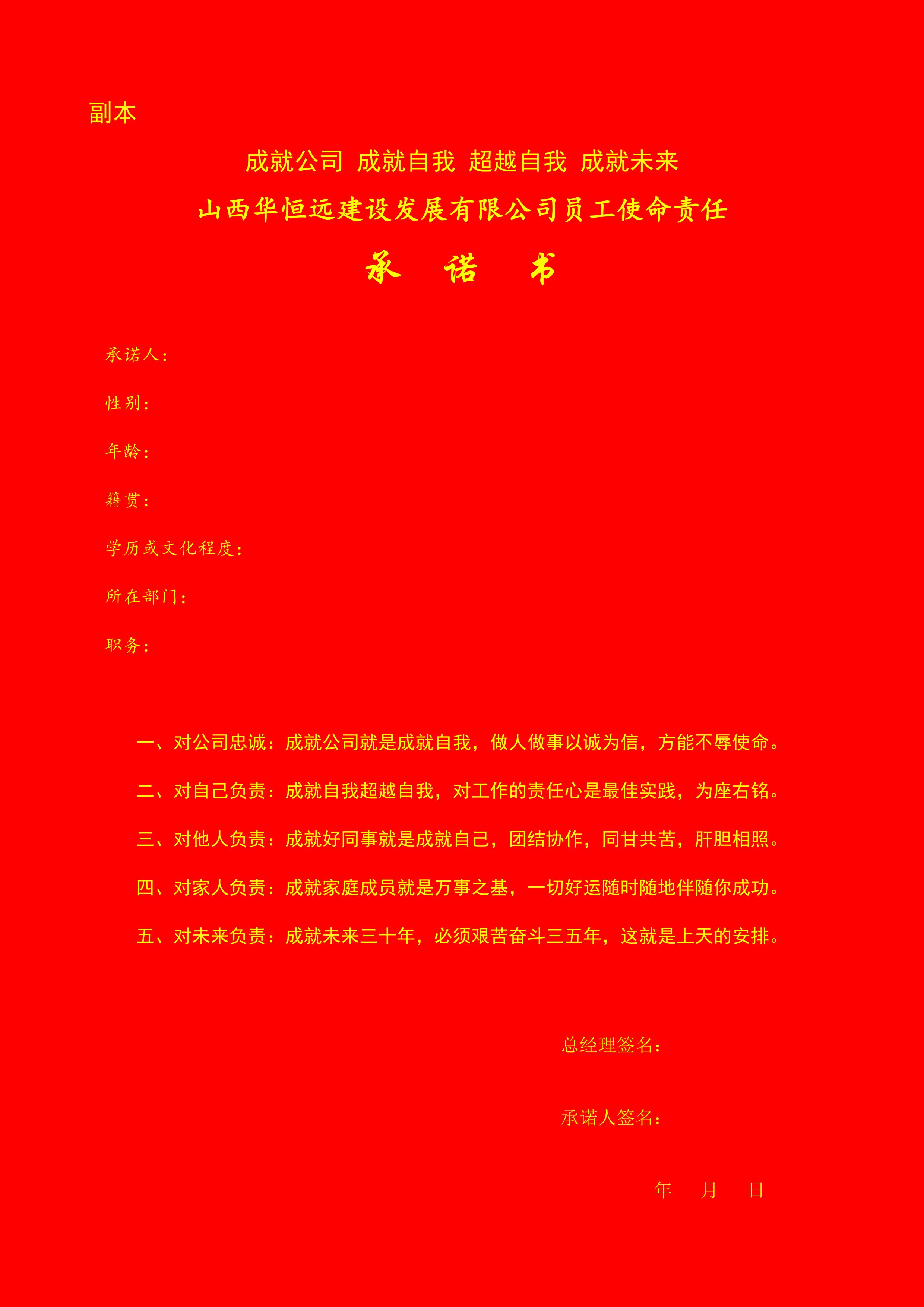 承諾書一式兩份,總經(jīng)理和承諾人各執(zhí)一份,作為對未來的承諾和勉勵!