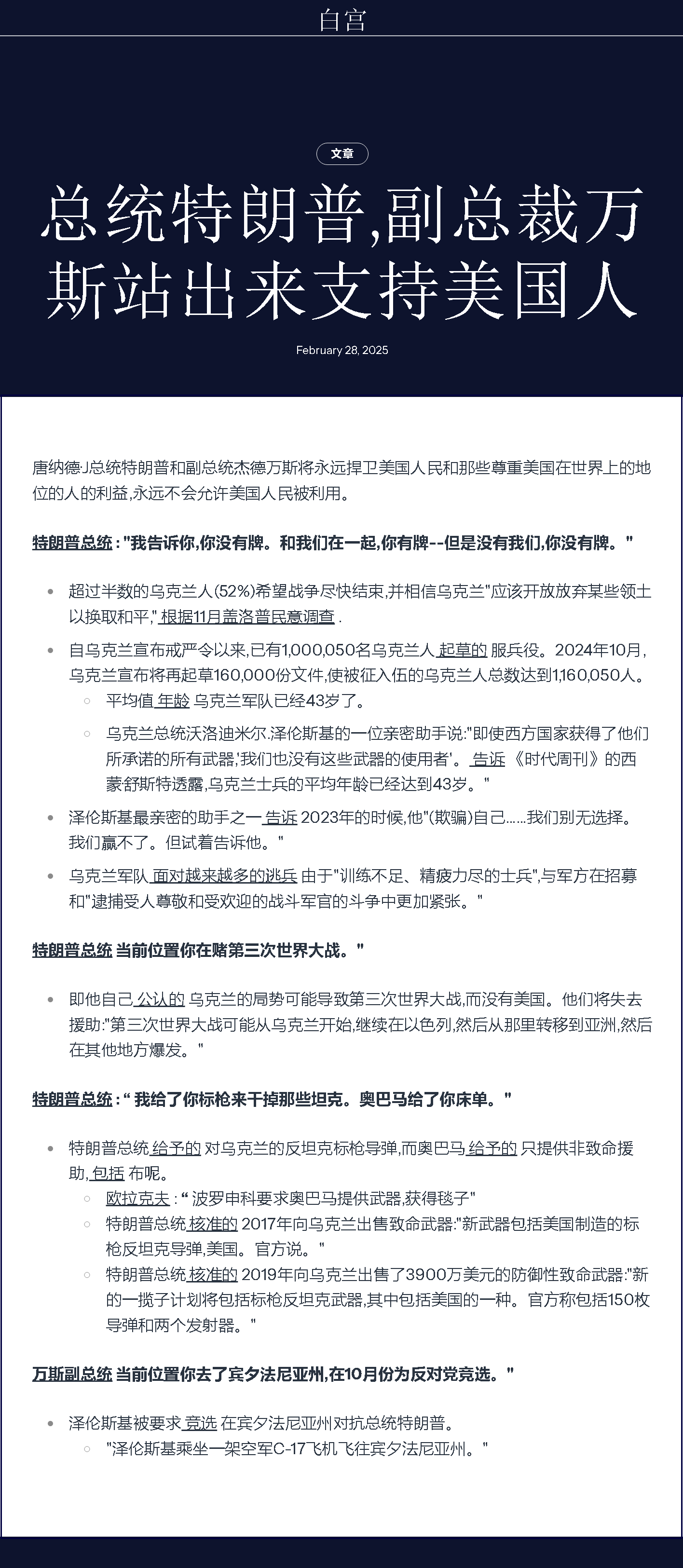 會談中,因關(guān)鍵問題分歧巨大,雙方激烈爭論,會晤提前結(jié)束。澤連斯基在離開白宮前并未回應(yīng)任何記者提問,雙方的聯(lián)合新聞發(fā)布會被取消,礦產(chǎn)協(xié)議未能簽署。