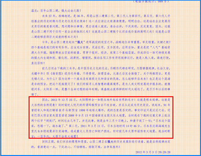 因此,2012年12月23日,太陽(yáng)照樣會(huì)一如既往地升起在世界的東方!這就是根本規(guī)律,這就是大自然的自然現(xiàn)象!到時(shí)候杞人憂天的所謂瑪雅預(yù)言會(huì)不攻自破,并且從此成為歷史笑談。說(shuō)起來(lái),91年曾經(jīng)有人和我打賭諾查丹馬斯預(yù)言1999年地球大爆炸,我的態(tài)度是否定的,事實(shí)印證只是泛泛之論。還有巴西大預(yù)言家朱瑟里諾說(shuō)2008年9月13中國(guó)海南發(fā)生毀滅性大地震,當(dāng)時(shí)我在下載的這篇文章上批注兩個(gè)紅字“胡說(shuō)!”,時(shí)間過(guò)去幾年了,并無(wú)此事。倒是去年三月十日晚上,和妻子說(shuō)了一句:“日本這個(gè)國(guó)家,忽塌一下,海水淹了?!?/strong>第二天,2011年3月11日,日本當(dāng)?shù)貢r(shí)間14時(shí)46分,日本東北部海域發(fā)生里氏9.0級(jí)地震并引發(fā)海嘯,造成重大人員傷亡和財(cái)產(chǎn)損失。針對(duì)前幾年太原市謠傳有大地震,我當(dāng)時(shí)斷言:一百年內(nèi),太原不會(huì)有大地震!