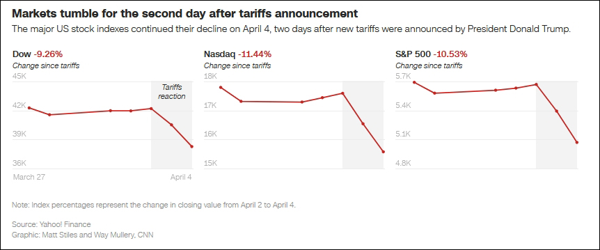 特朗普宣布關(guān)稅以來,美股三大指數(shù)大幅下跌 CNN制圖