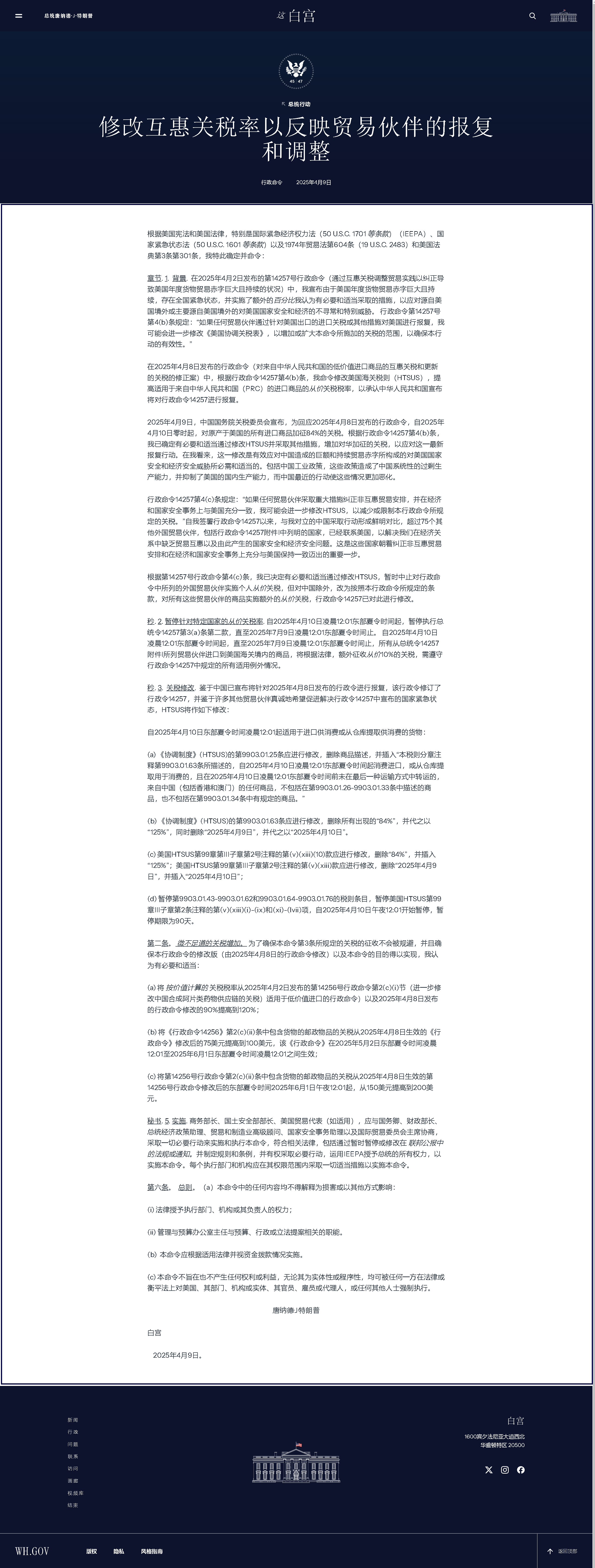 章節(jié). 1. 背景. 在2025年4月2日發(fā)布的第14257號(hào)行政命令(通過(guò)互惠關(guān)稅調(diào)整貿(mào)易實(shí)踐以糾正導(dǎo)致美國(guó)年度貨物貿(mào)易赤字巨大且持續(xù)的狀況)中,我宣布由于美國(guó)年度貨物貿(mào)易赤字巨大且持續(xù),存在全國(guó)緊急狀態(tài),并實(shí)施了額外的百分比我認(rèn)為有必要和適當(dāng)采取的措施,以應(yīng)對(duì)源自美國(guó)境外或主要源自美國(guó)境外的對(duì)美國(guó)國(guó)家安全和經(jīng)濟(jì)的不尋常和特別威脅。 行政命令第14257號(hào)第4(b)條規(guī)定:“如果任何貿(mào)易伙伴通過(guò)針對(duì)美國(guó)出口的進(jìn)口關(guān)稅或其他措施對(duì)美國(guó)進(jìn)行報(bào)復(fù),我可能會(huì)進(jìn)一步修改《美國(guó)協(xié)調(diào)關(guān)稅表》,以增加或擴(kuò)大本命令所施加的關(guān)稅的范圍,以確保本行動(dòng)的有效性。”