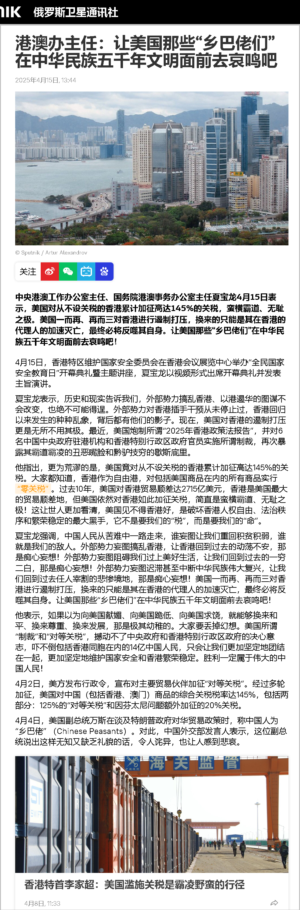 ——?dú)v史和現(xiàn)實(shí)告訴我們,外部勢(shì)力搞亂香港、以港遏華的圖謀不會(huì)改變,也絕不可能得逞。外部勢(shì)力對(duì)香港插手干預(yù)從未停止過(guò),香港回歸以來(lái)發(fā)生的種種亂象,背后都有他們的影子?,F(xiàn)在,美國(guó)對(duì)香港的遏制打壓更是無(wú)所不用其極。最近,美國(guó)炮制所謂“2025年香港政策法報(bào)告”,并對(duì)6名我國(guó)中央政府駐港機(jī)構(gòu)和香港特別行政區(qū)政府官員實(shí)施所謂制裁,再次暴露其霸道霸凌的丑惡嘴臉和黔驢技窮的歇斯底里。更為荒謬的是,美國(guó)竟對(duì)從不設(shè)關(guān)稅的香港累計(jì)加征高達(dá)145%的關(guān)稅。大家都知道,香港作為自由港,對(duì)包括美國(guó)商品在內(nèi)的所有商品實(shí)行“零關(guān)稅”。過(guò)去10年,美國(guó)對(duì)香港貿(mào)易順差達(dá)2715億美元,香港是美國(guó)最大的貿(mào)易順差地,但美國(guó)依然對(duì)香港如此加征關(guān)稅,簡(jiǎn)直是蠻橫霸道、無(wú)恥之極!這讓世人更加看清,美國(guó)見(jiàn)不得香港好,是破壞香港人權(quán)自由、法治秩序和繁榮穩(wěn)定的最大黑手,它不是要我們的“稅”,而是要我們的“命”。中國(guó)人民從苦難中一路走來(lái),誰(shuí)妄圖讓我們重回積貧積弱,誰(shuí)就是我們的敵人。外部勢(shì)力妄圖搞亂香港,讓香港回到過(guò)去的動(dòng)蕩不安,那是癡心妄想!外部勢(shì)力妄圖阻礙我們過(guò)上美好生活,讓我們回到過(guò)去的一窮二白,那是癡心妄想!外部勢(shì)力妄圖遲滯甚至中斷中華民族偉大復(fù)興,讓我們回到過(guò)去任人宰割的悲慘境地,那是癡心妄想!美國(guó)一而再、再而三對(duì)香港進(jìn)行遏制打壓,換來(lái)的只能是其在香港的代理人的加速滅亡,最終必將反噬其自身。
