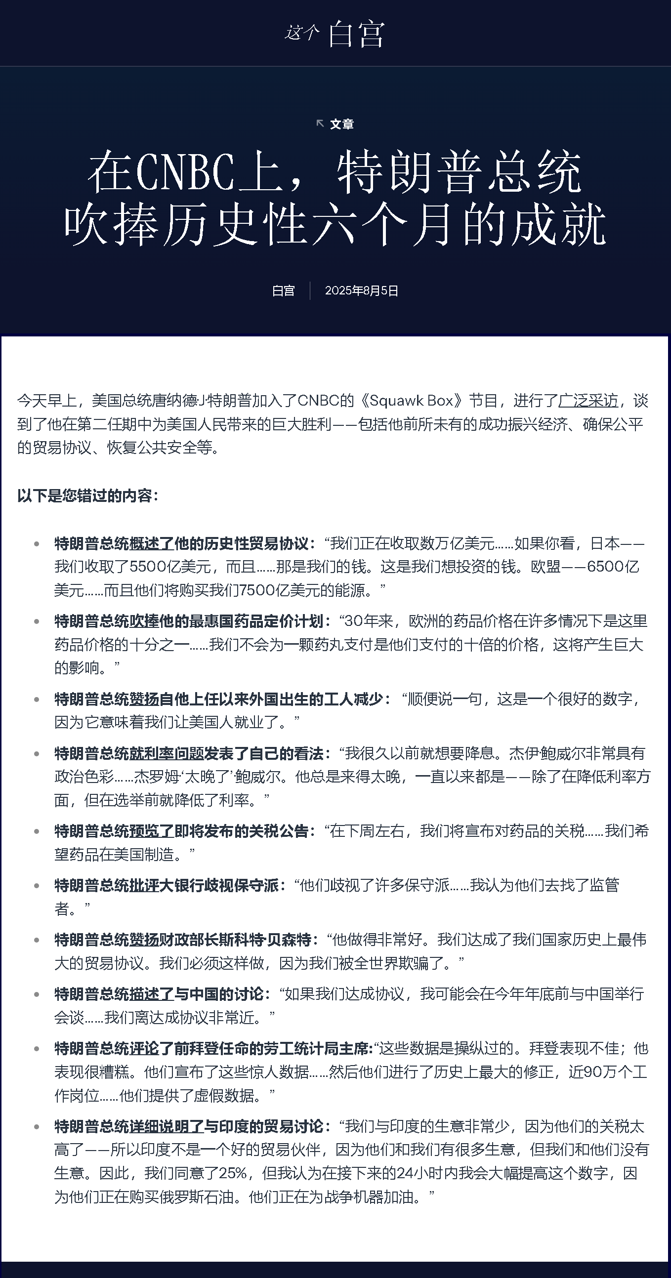 今天早上,美國總統(tǒng)唐納德·J·特朗普加入了CNBC的《Squawk Box》節(jié)目,進行了廣泛采訪,談到了他在第二任期中為美國人民帶來的巨大勝利——包括他前所未有的成功振興經(jīng)濟、確保公平的貿(mào)易協(xié)議、恢復(fù)公共安全等。