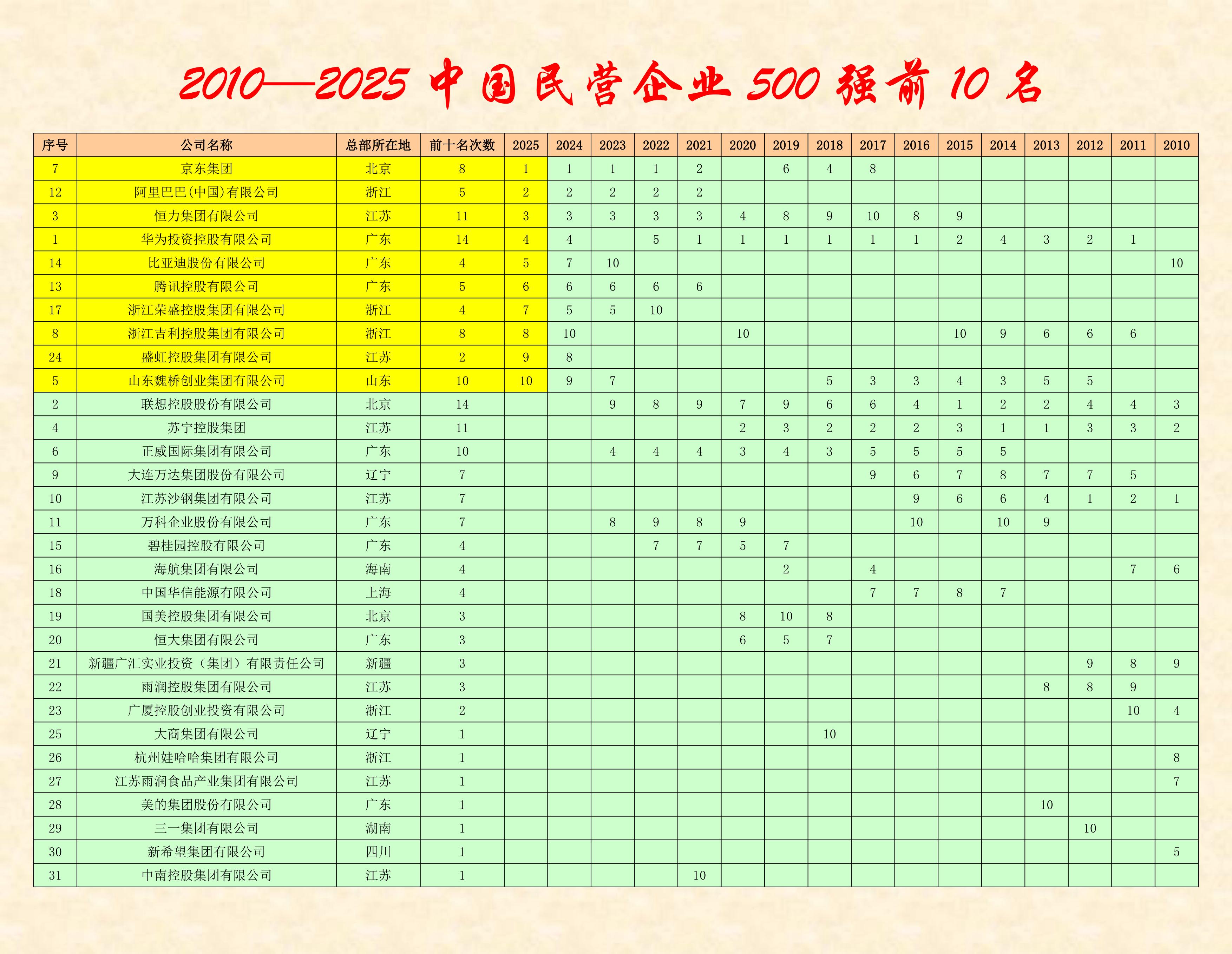 2010—2025十六年中國民營企業(yè)500強(qiáng)前十名都是哪家公司