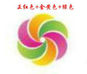 六葉以正上方紅色(太陽)→金黃色(土地)→綠色(萬物)→紅色(太陽)→金黃色(土地)→綠色(萬物),順時(shí)針循環(huán)。每片葉片柄圍繞中心圓點(diǎn),葉尖稍稍收回。總體看是一個(gè)旋轉(zhuǎn)的飛輪,細(xì)細(xì)觀是一朵盛開的鮮花!
