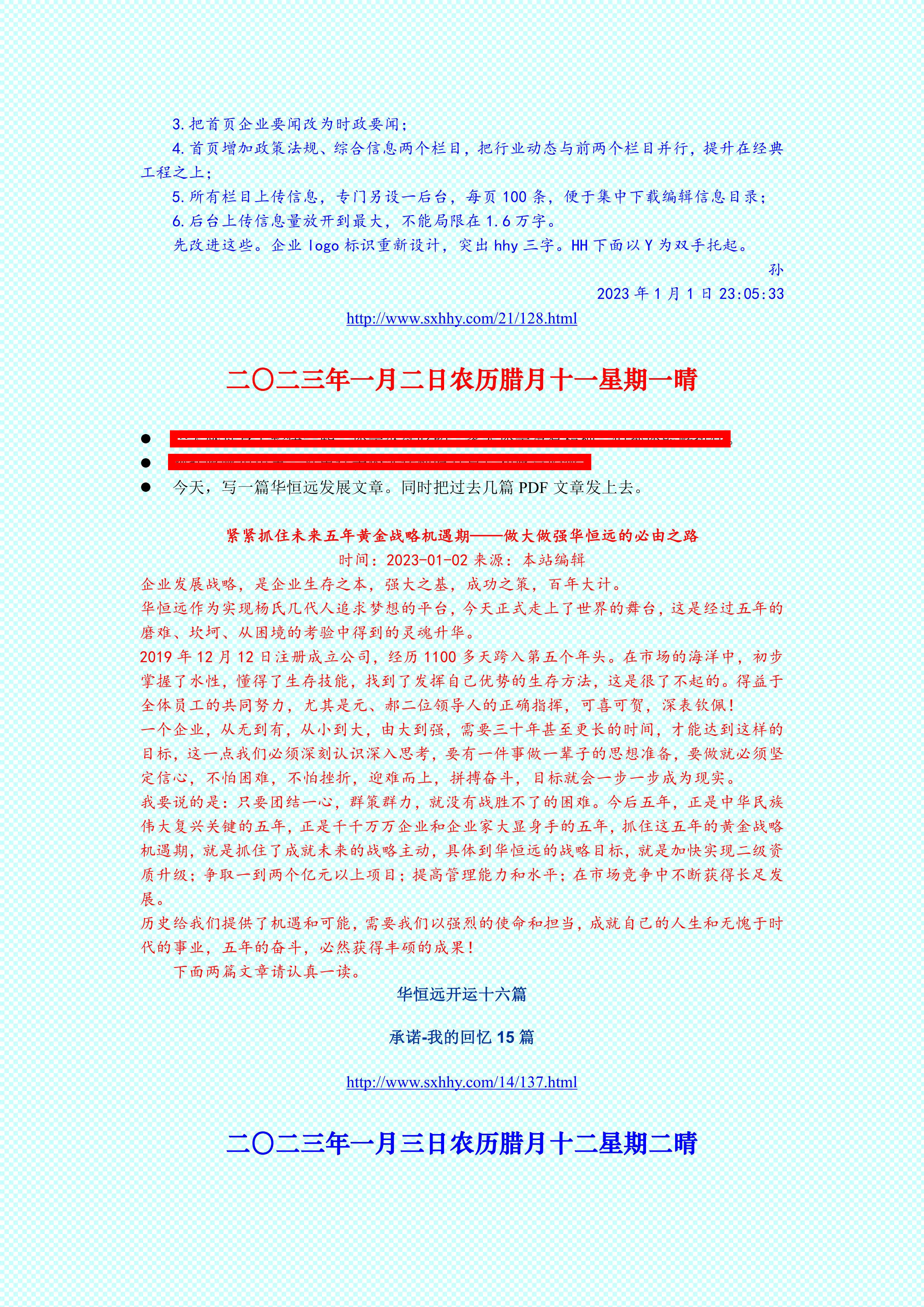 下面是2023年我的日記第一天和第二天,帖出來與華恒遠(yuǎn)的創(chuàng)業(yè)者分享,拋磚引玉,提升寫日記的感悟、感應(yīng)和靈感,讓自己的靈性釋放,理想奔放,信心倍增,如此才是行之有效的啟發(fā)和教化!