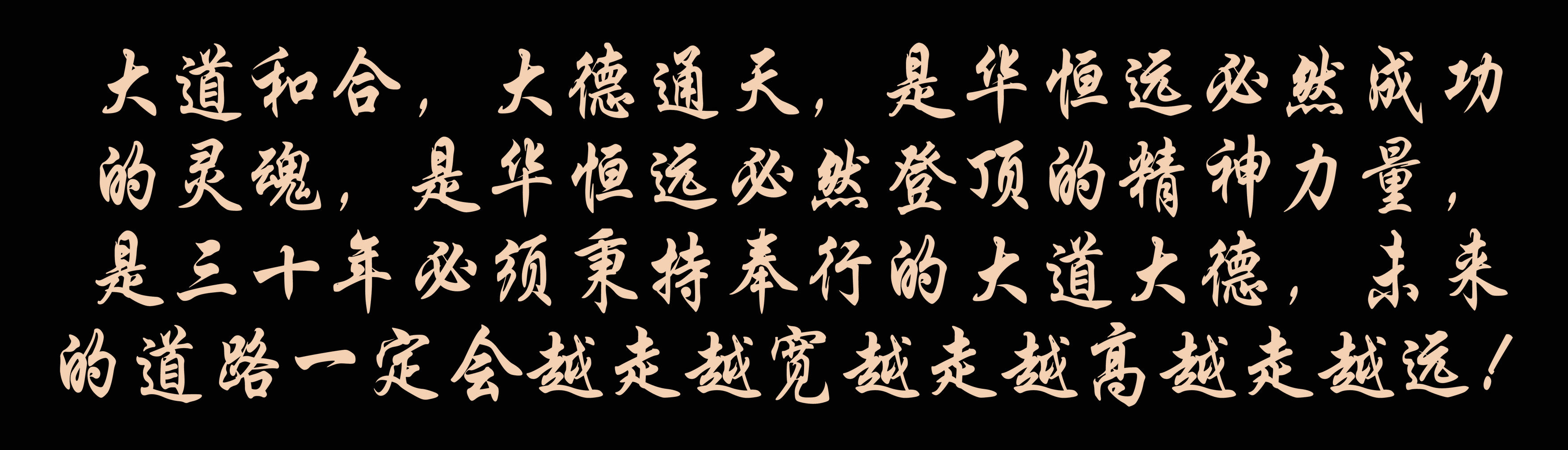 大道和合,大德通天,是華恒遠(yuǎn)必然成功的靈魂,是華恒遠(yuǎn)必然登頂?shù)木窳α?,是三十年必須秉持奉行的大道大德,未來的道路一定?huì)越走越寬越走越高越走越遠(yuǎn)!