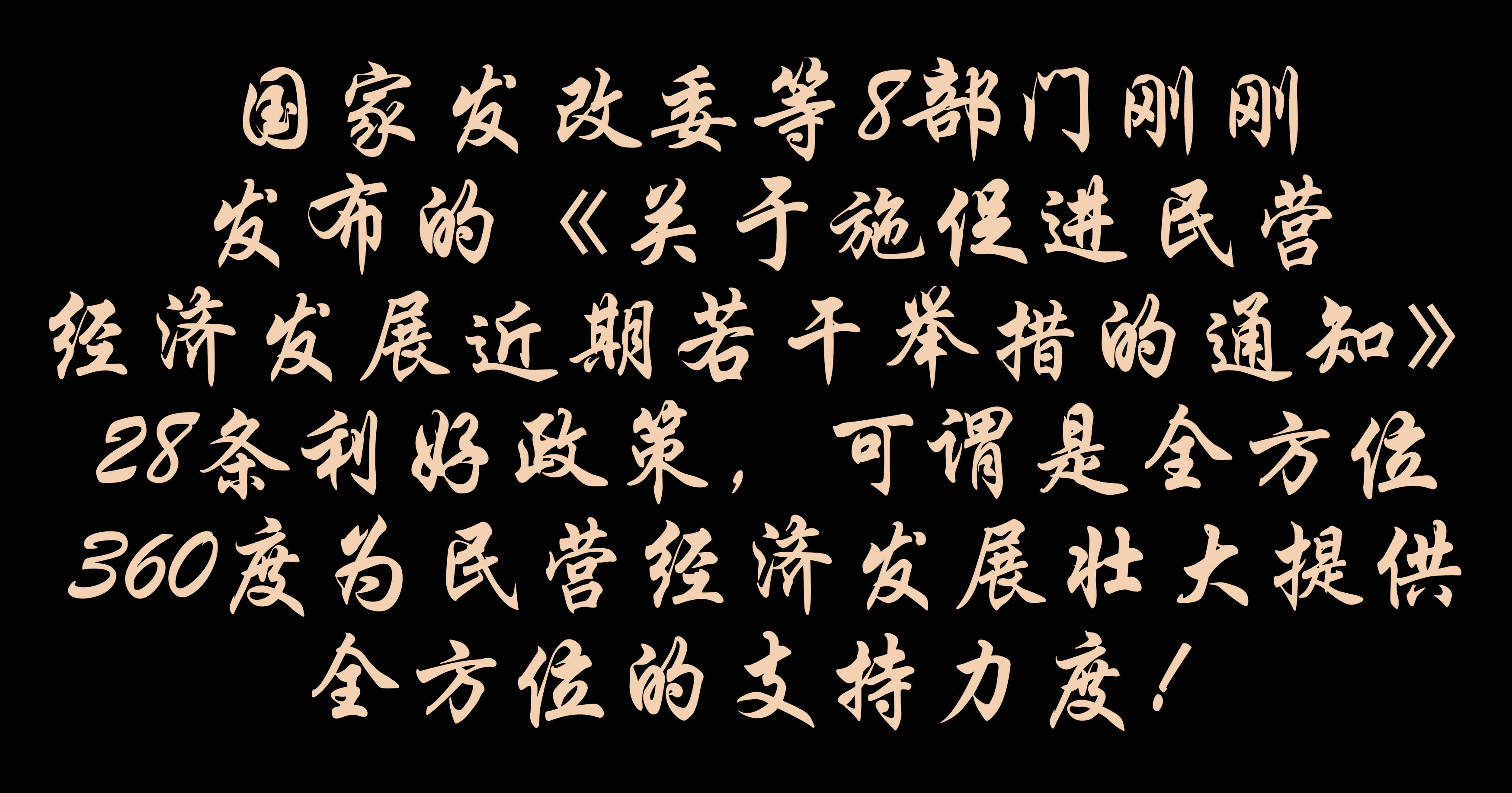國(guó)家發(fā)改委等8部門剛剛發(fā)布的《關(guān)于實(shí)施促進(jìn)民營(yíng)經(jīng)濟(jì)發(fā)展近期若干舉措的通知》28條利好政策,可謂是全方位360度為民營(yíng)經(jīng)濟(jì)發(fā)展壯大提供全方位支持的力度,對(duì)于民營(yíng)企業(yè)來說可謂是千載難逢的機(jī)遇期,對(duì)于民營(yíng)企業(yè)家來說可謂是定心丸和助跑器,把做大做強(qiáng)自己的企業(yè)作為一種使命和任務(wù),這才是對(duì)國(guó)家和民族義不容辭的責(zé)任的最好行動(dòng)!