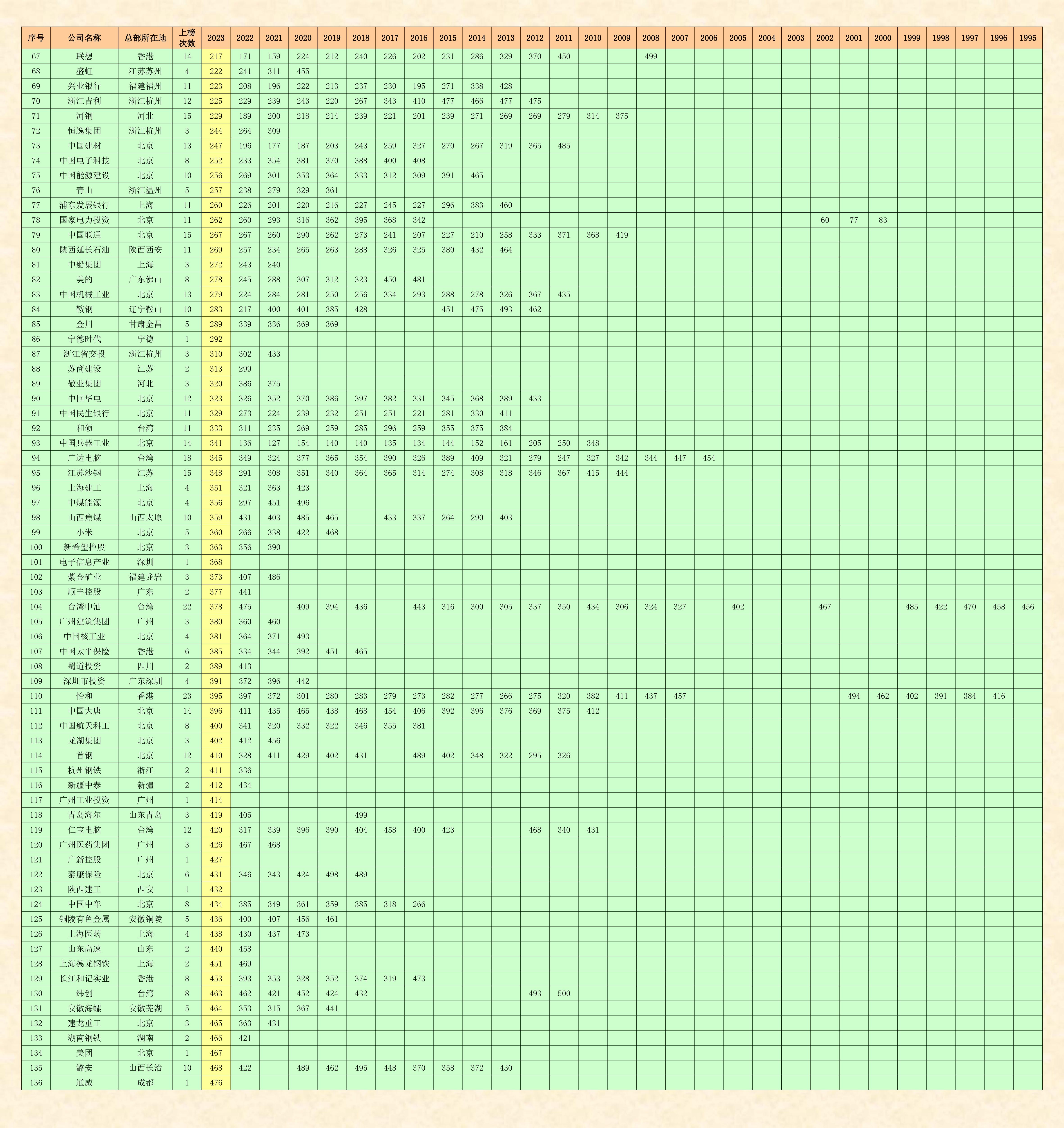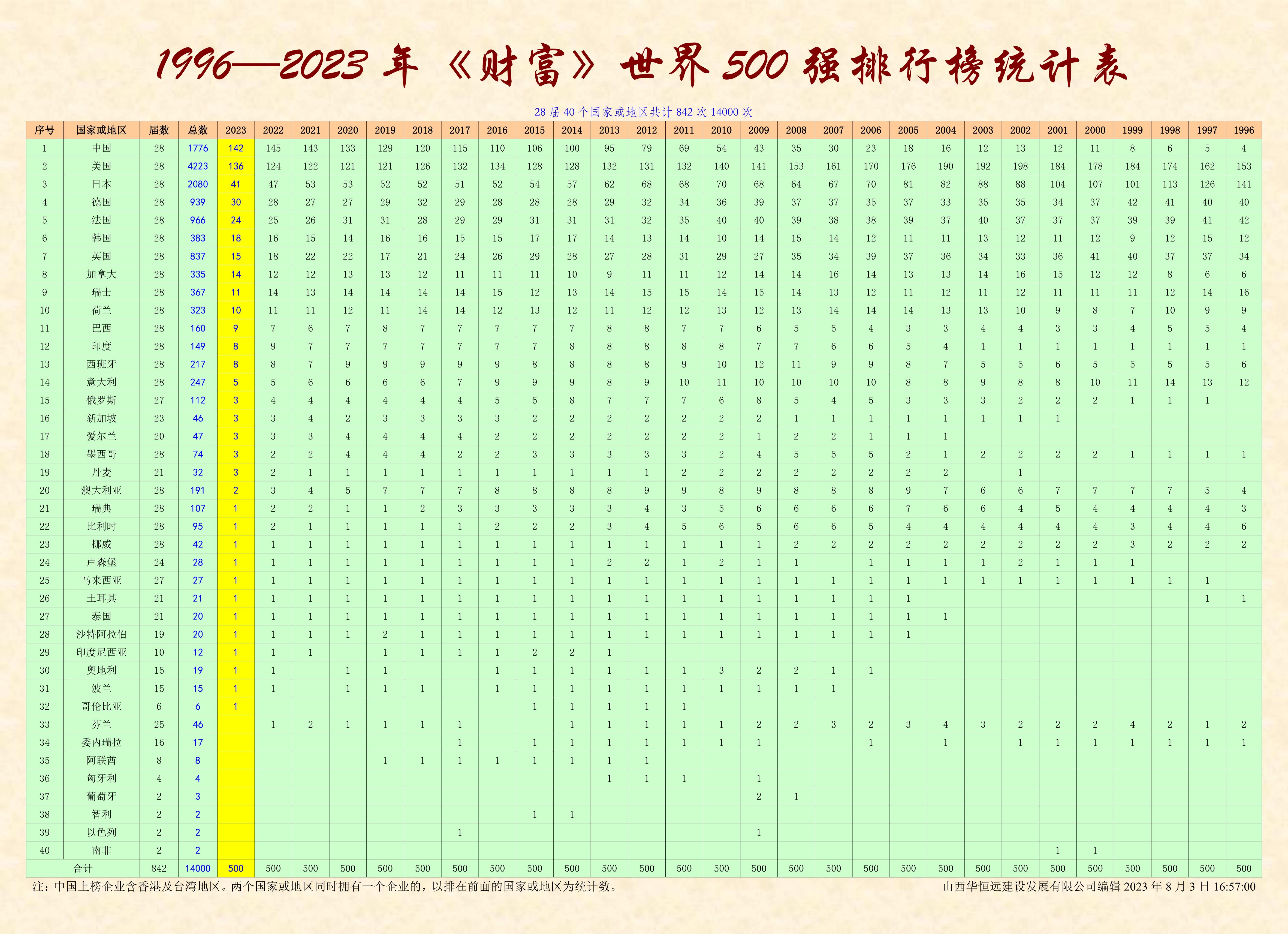 《財富》世界500強雜志社,從1995年開始在中國登陸,已經(jīng)連續(xù)舉辦了29期中文版的世界500強排名榜,我收集到的完整資料,僅缺第一期1995年的全榜單,所以,目前只能編輯二十八期。即1996-2023年《財富》世界500強和中國上榜企業(yè)的名單,待日后有機會的話再補齊。