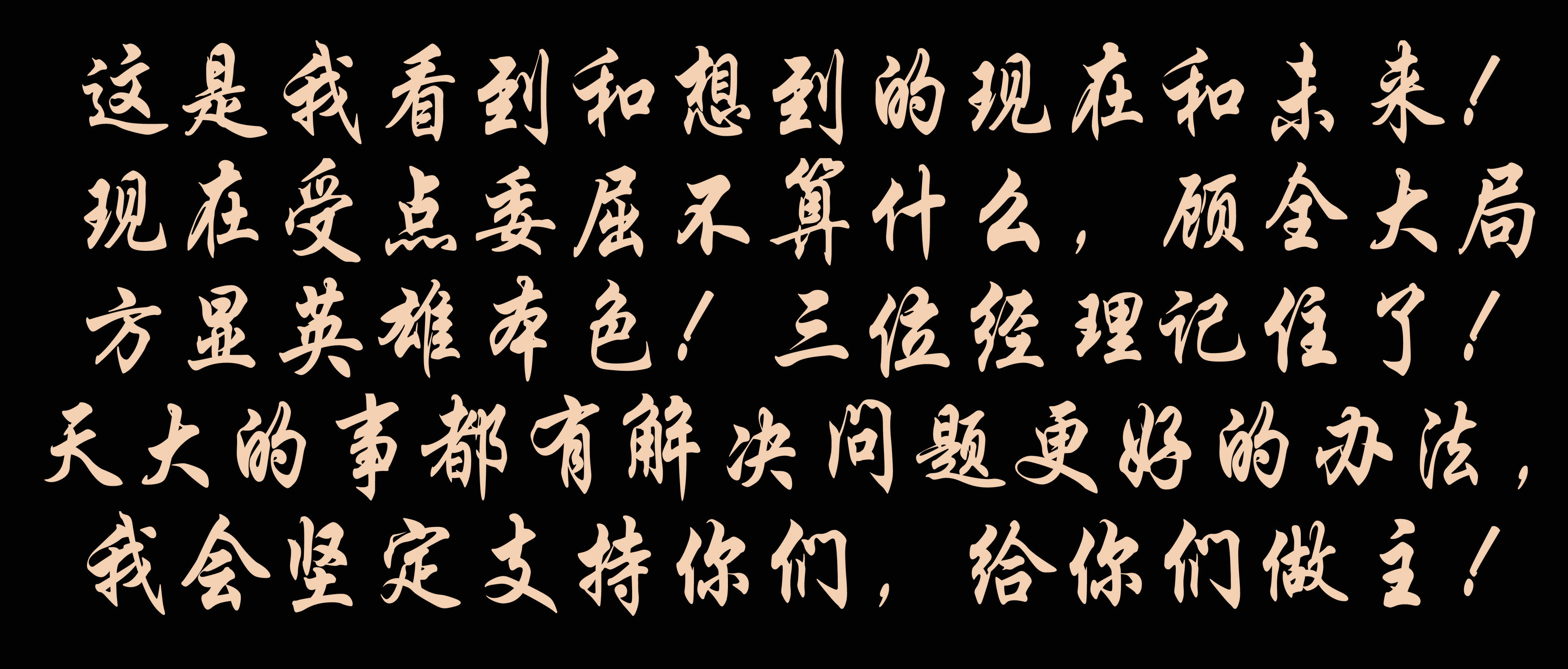 這是我看到和想到的現(xiàn)在和未來!現(xiàn)在受點委屈不算什么,顧全大局方顯英雄本色!三位經(jīng)理記住了!