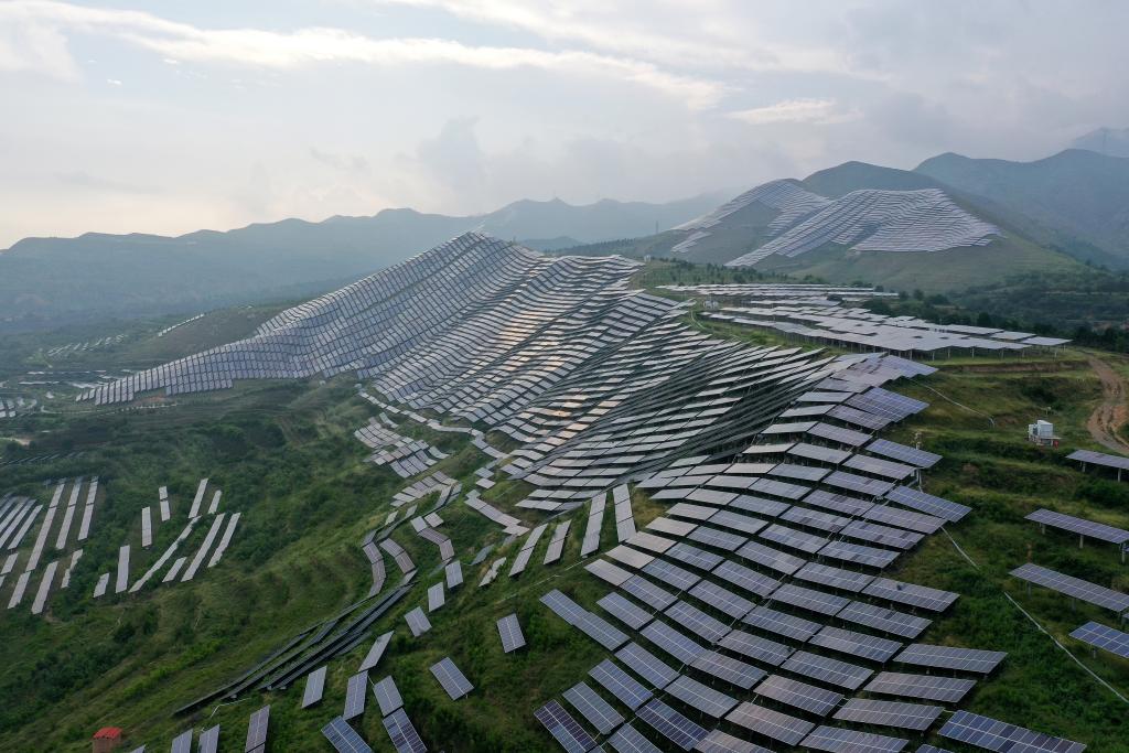 7月12日,山西省芮城縣學張鄉(xiāng)光伏電站(無人機照片)。新華社記者 詹彥 攝