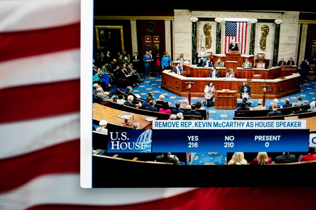這是2023年10月3日拍攝的美國華盛頓國會眾議院投票罷免共和黨籍眾議長麥卡錫的直播畫面。新華社記者劉杰攝