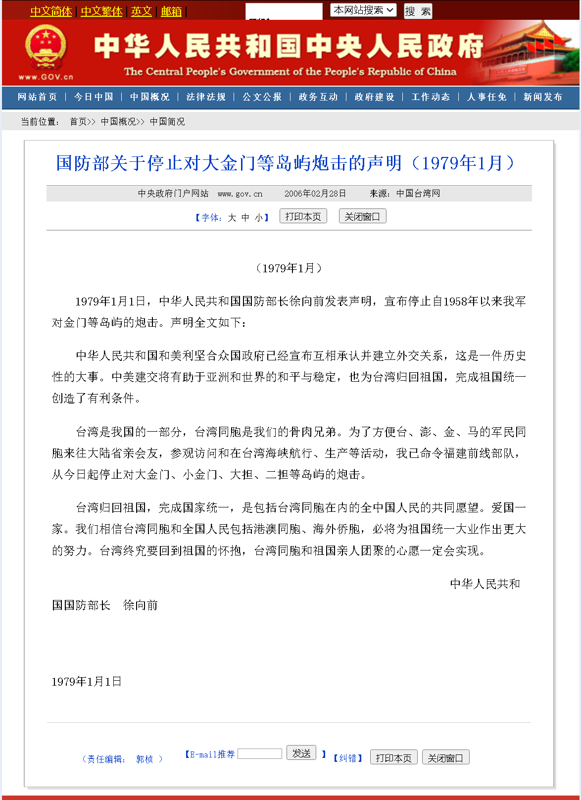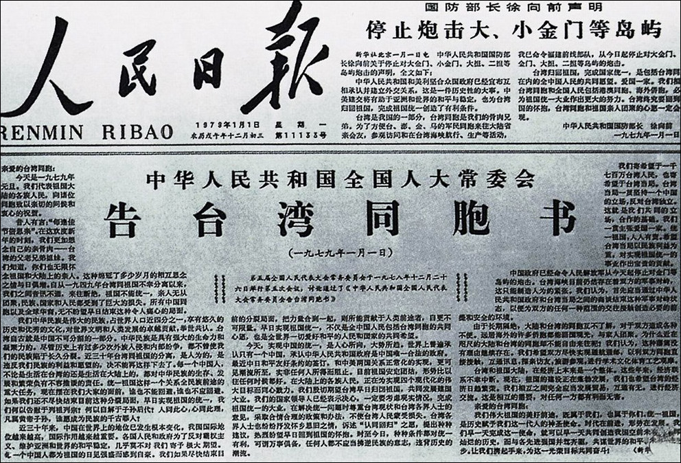 1979年元旦,中國同美國正式建立外交關(guān)系。同日,全國人大常委會發(fā)表《告臺灣同胞書》,正式提出實現(xiàn)和平統(tǒng)一的大政方針;時任國防部長徐向前發(fā)表聲明,宣布停止自1958年以來解放軍對金門等島嶼的炮擊。
