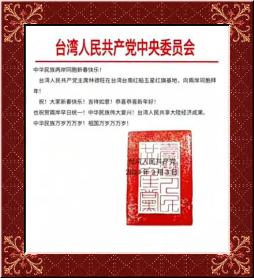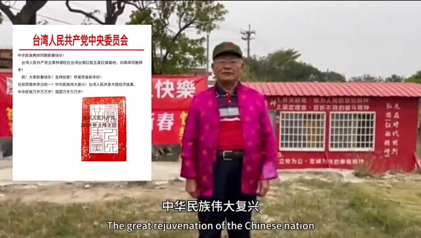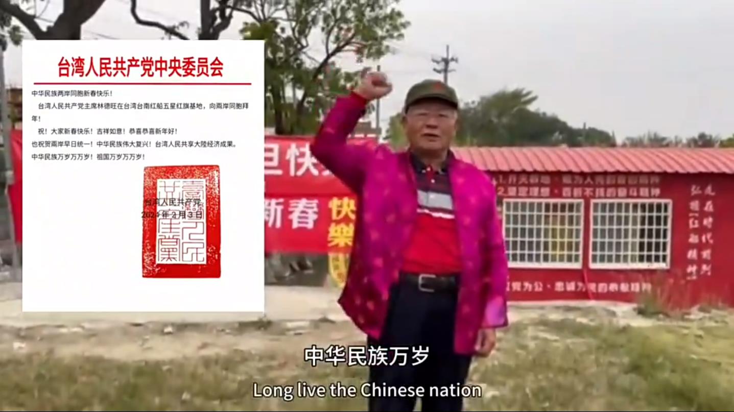 臺灣人民共產(chǎn)黨主席林德旺在臺灣臺南紅船五星紅旗基地,向兩岸同胞拜年!