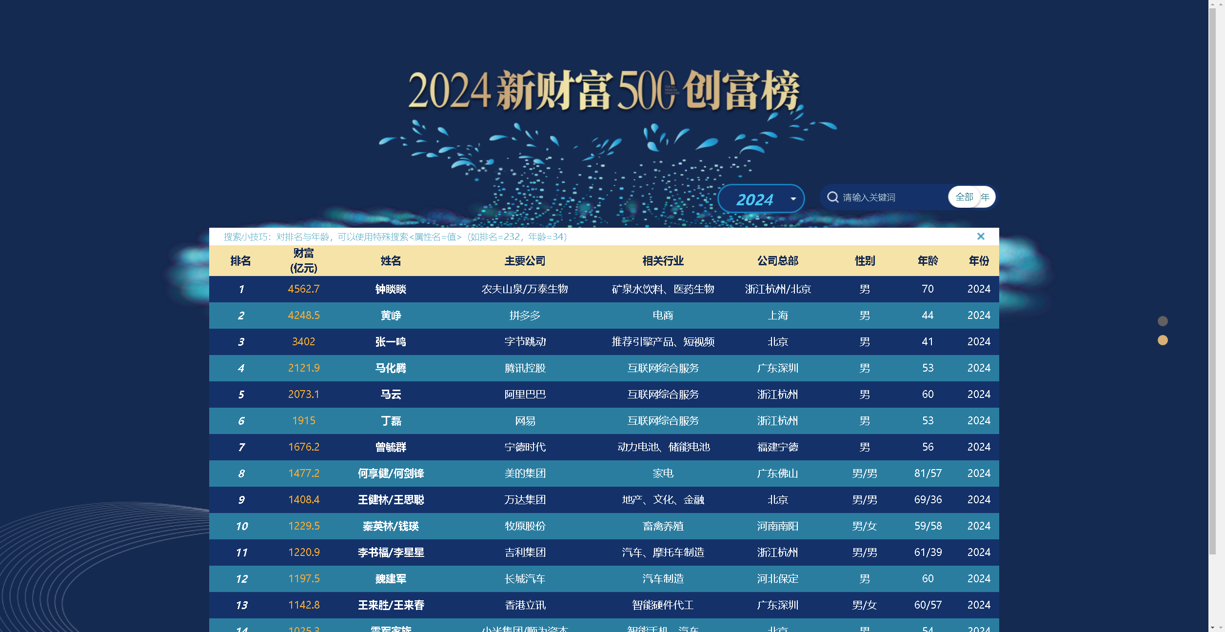 序號(hào) 姓名 性別 年齡 年度 排名 財(cái)富億元 總部所在地 公司名稱(chēng) 所屬行業(yè) 總序號(hào)