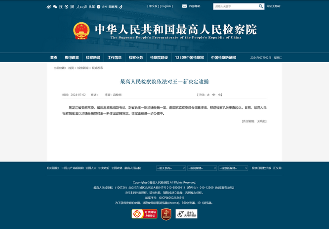 新華社北京7月2日電 記者2日從最高人民檢察院獲悉,黑龍江省委原常委,省政府原黨組副書記、副省長王一新涉嫌受賄一案,由國家監(jiān)察委員會調(diào)查終結(jié),移送檢察機(jī)關(guān)審查起訴。日前,最高人民檢察院依法以涉嫌受賄罪對王一新作出逮捕決定。該案正在進(jìn)一步辦理中。